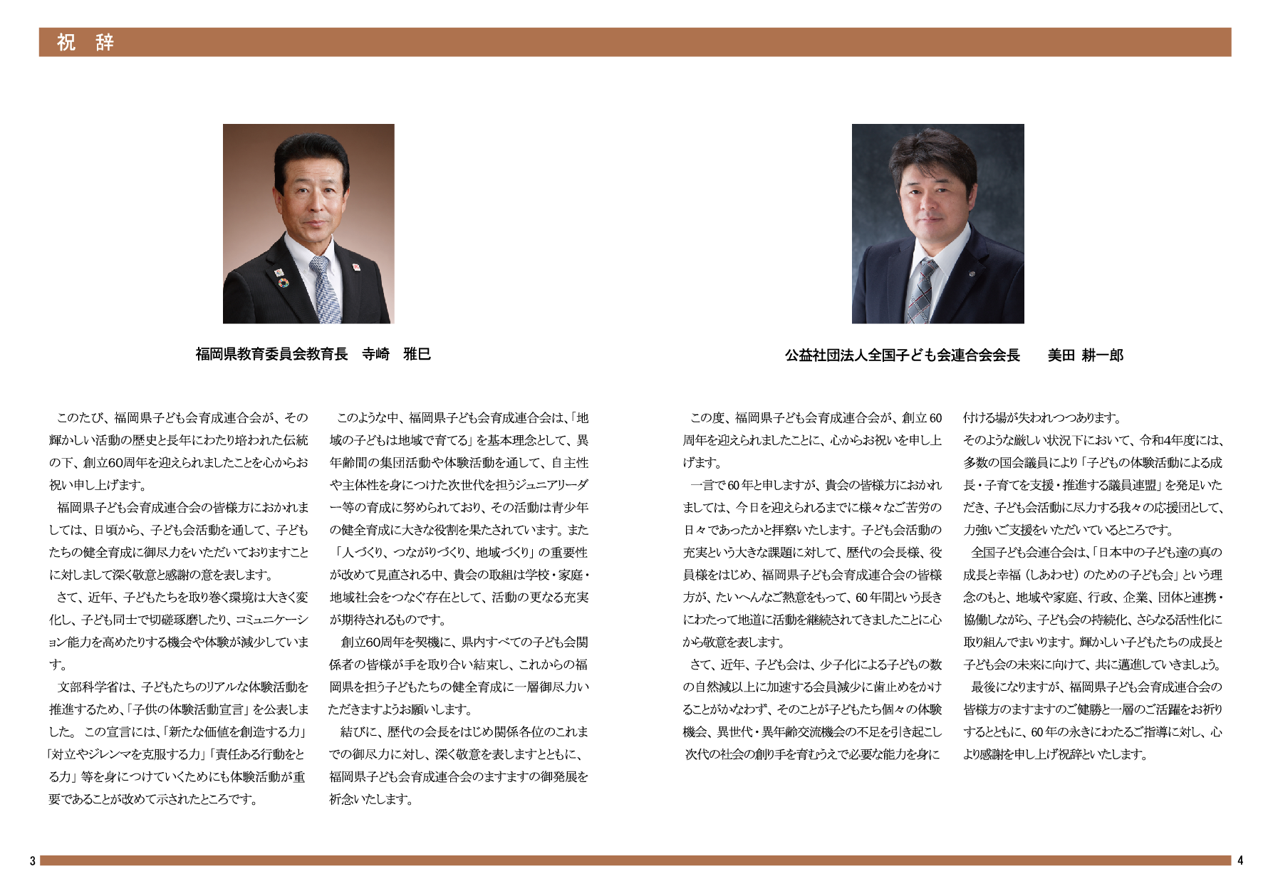 福岡県子ども会育成連合会は、2024年に創立60周年を迎え、記念誌「はばたけ100号」発行しました。近年10年間の活動や、60年のあゆみをまとめた紙面となっております。こちらでは、見開きページの画像でご紹介いたします。これからの子ども会活動にも、お役に立つことができれば嬉しく思います。